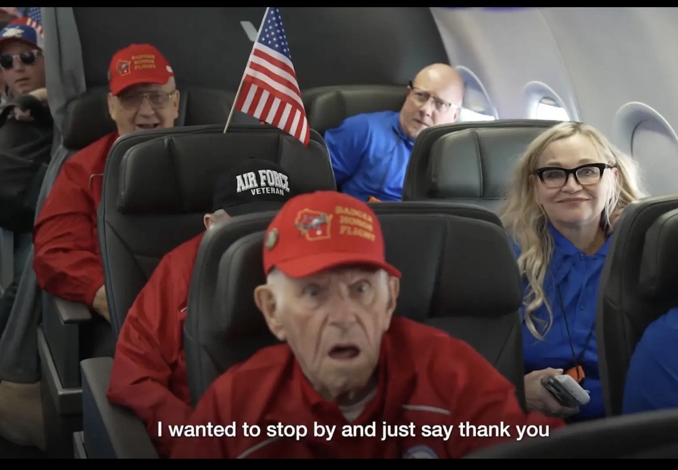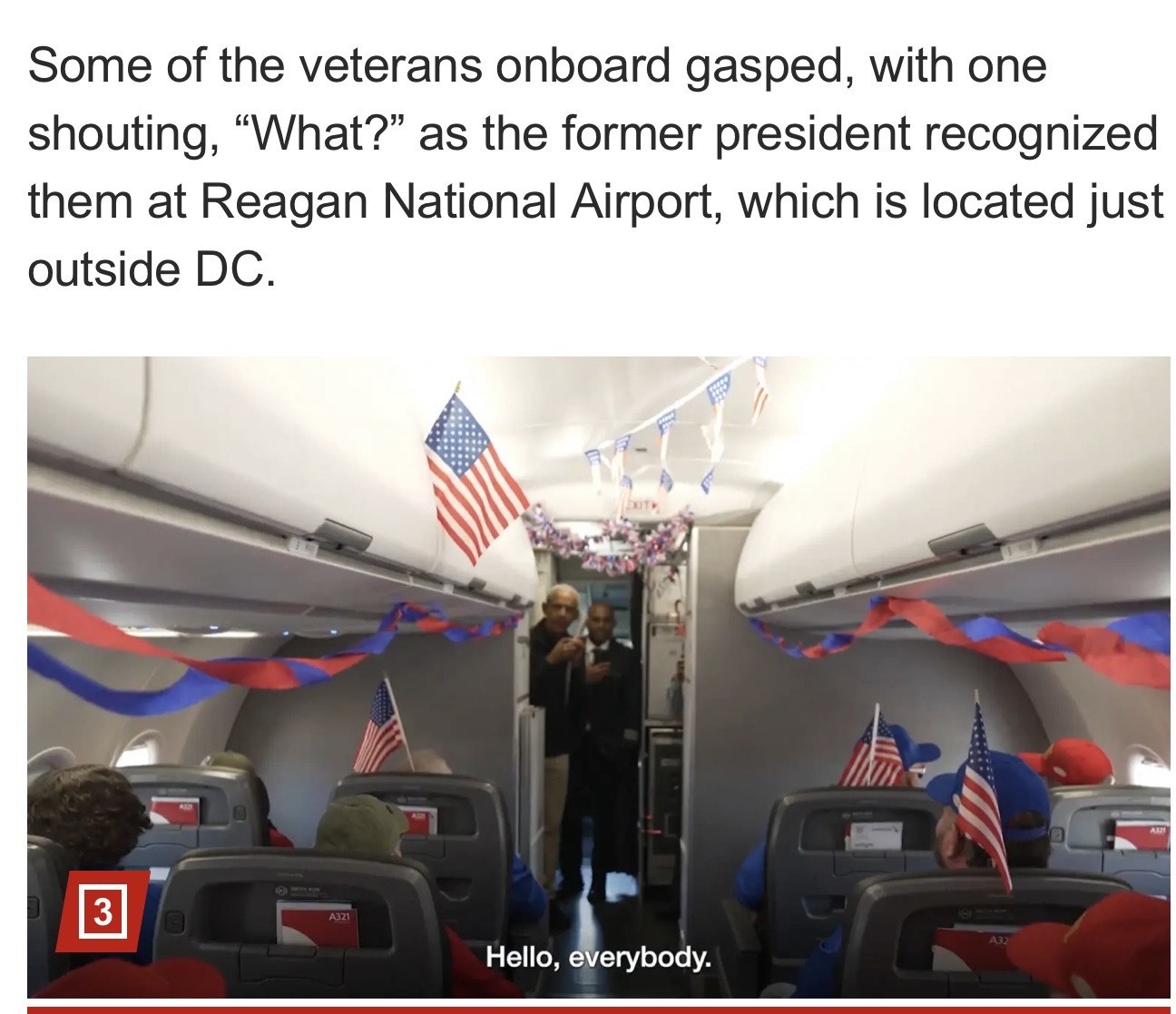 As the veterans disembarked, Obama boarded the plane, addressed them via the intercom saying:
