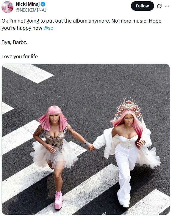 In a move that has truly shaken the Internet, Nicki Minaj has declared she is done with music. The rap icon took to X last Tuesday nights and dropped bombshell after bombshell tweet, all of which ultimately led to her exit from the music industry. The following post sent the Barbz into a collective meltdown, within minutes “No More Musice??” was trending worldwide. The Barbz flooded the timelines with heartbreak and disbelief, that this was then of their beloved Queen. Could Queen Nicki, Roman, Barbie, Cookie, Chun Li be gone from mainstream music forever?
