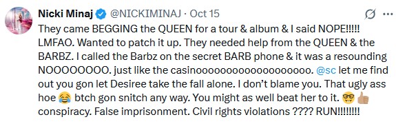Many of those close to Nicki have said she has been clashing with industry execs with the creation of her upcoming album and felt “boxed in” creatively. The tweet below shows Nicki explaining that there are people around her who want to see her fail and block her bag. This tweet might have been the last straw, but Nicki had more to say and more people to call out personally