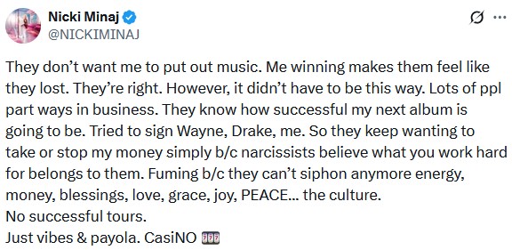 This move wasn’t really that shocking to those who were paying attention to Nicki’s earlier tweets. Nicki Minaj’s highly anticipated sixth studio album, rumored for a March 2026 release, had been shrouded in delays, label drama, and behind-the-scenes tension.