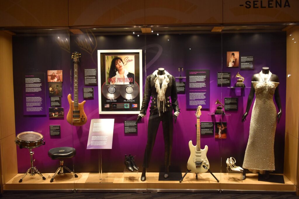 Items from the “Selena: From Texas to the World” exhibit at the Grammy Museum in Los Angeles, featuring the singer’s iconic stage costumes and awards. (Photo: Getty Images, 2017).